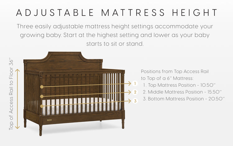 - The wooden mattress support features three adjustable height settings to accommodate your growing baby | Access rail dimensions: From Floor: 36"; From Top Mattress Support Position: 16.50"; From Bottom Mattress Support Position: 26.50"