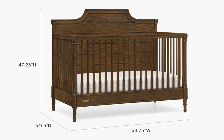 Designed with heirloom character and refined craftsmanship, the Lucca 6-in-1 Convertible Crib brings elevated elegance to the nursery. A textured glazed finish highlights the handcrafted detailing, while a paneled headboard with curved detailing, regal crown molding and modern spindles create a statement-worthy silhouette. Built to evolve with your child as they grow, this versatile crib converts a to a toddler bed, daybed, sofa and full-size bed with and without footboard (Daybed/Sofa Rail included, Toddler Guardrail and Full Size Wood Bed Rails sold separately). The Lucca’s thoughtful construction makes it a worthy investment that lasts a lifetime, adapting with your child every step of the way, from the baby years and beyond.