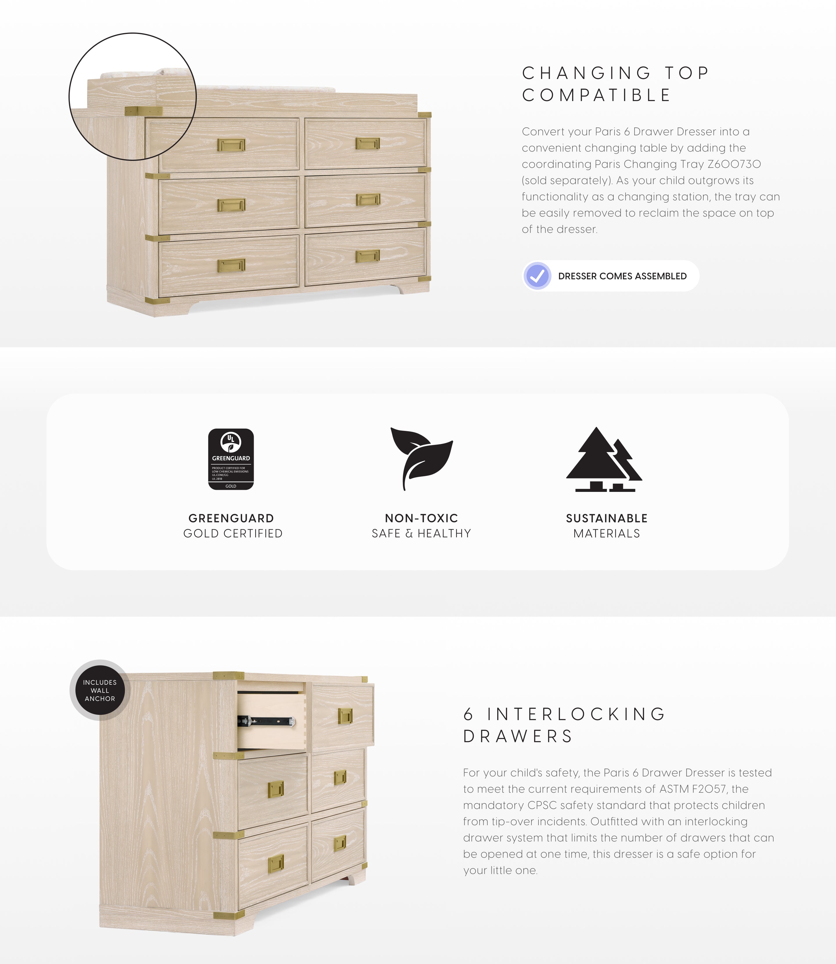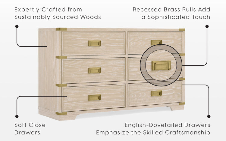 - The Paris 6 Drawer Dresser is expertly crafted from sustainably material like New Zealand Pine, Ash Veneer and TSCA compliant engineered wood