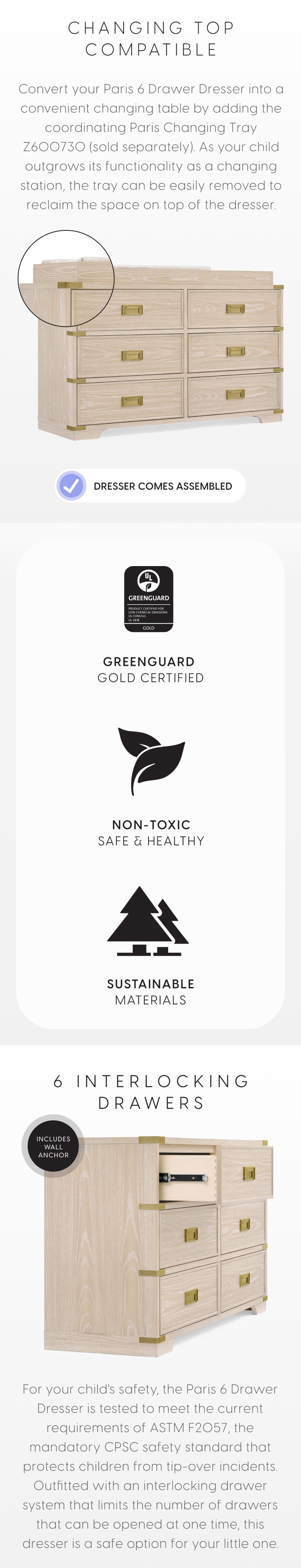 - Convert your Paris 6 Drawer Dresser into a convenient changing table by adding the coordinating Paris Changing Tray (sold separately)