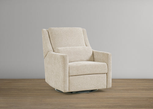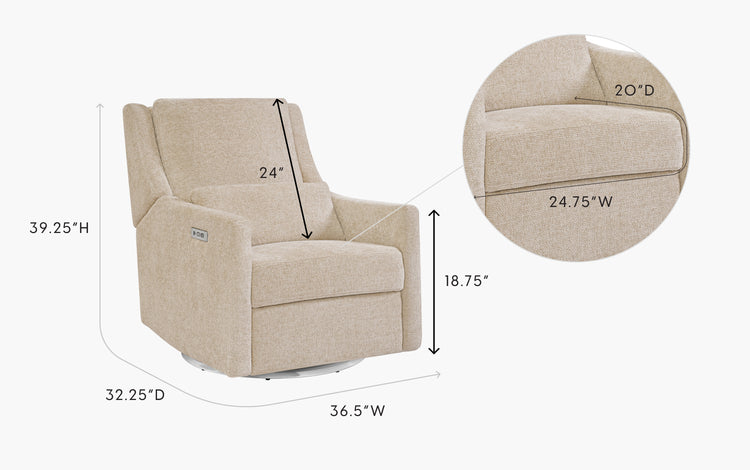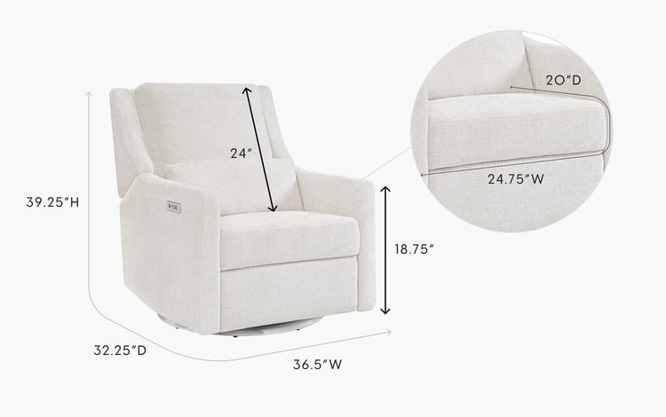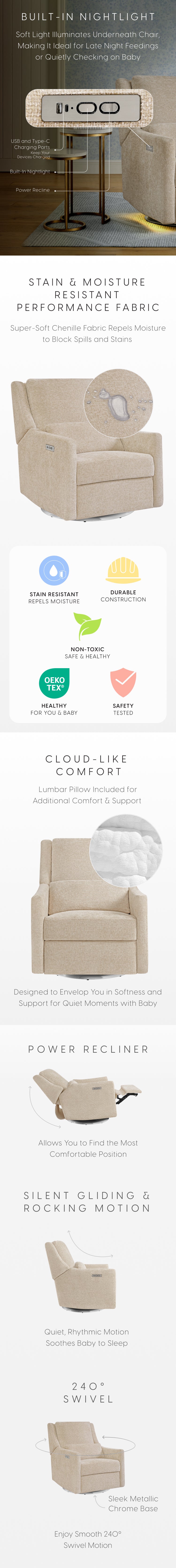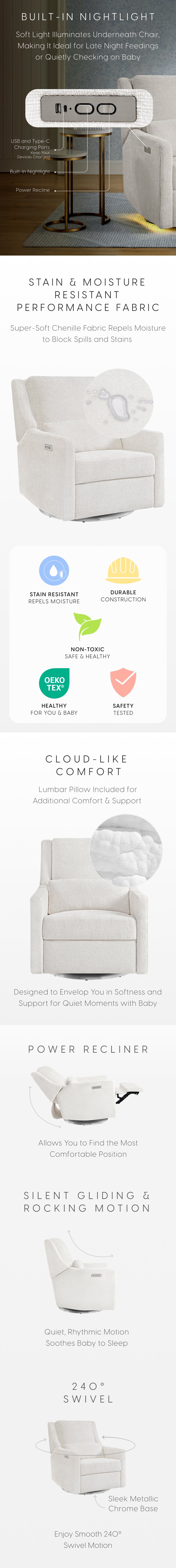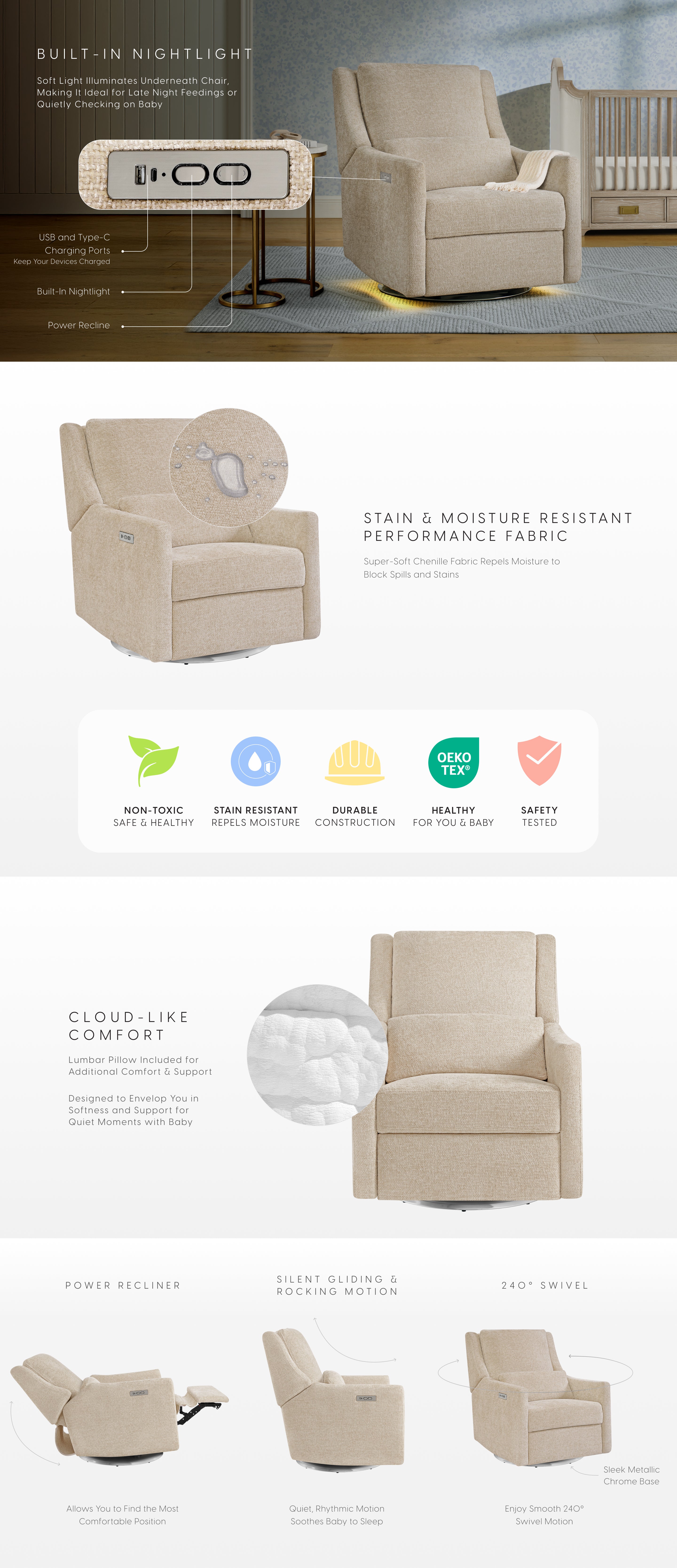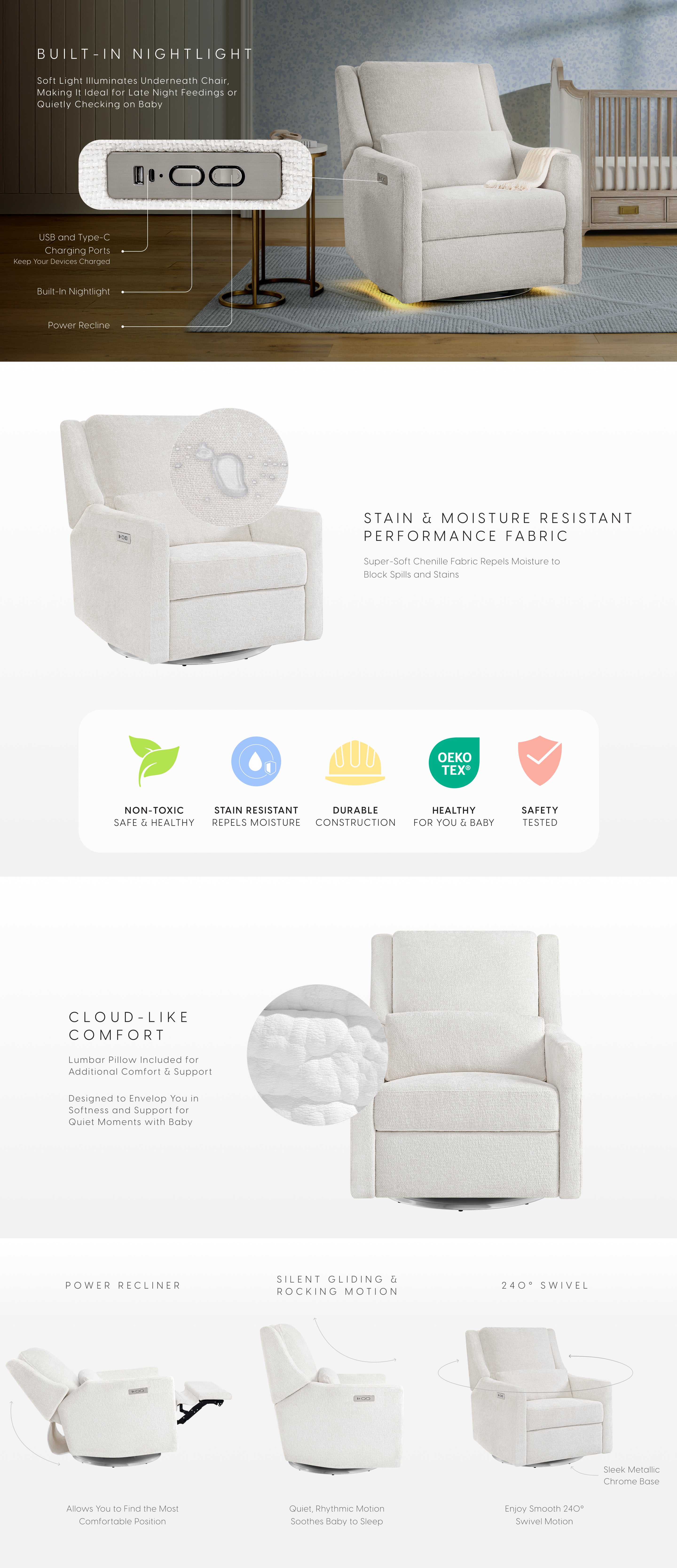 The Bellini Seoul Power Recliner combines supreme comfort with modern amenities. The plush seat and included lumbar pillow for additional support keeps you comfortable as you soothe your baby to sleep. Upholstered in a super-soft chenille fabric that’s stain-resistant, GREENGUARD Gold Certified and OEKO-TEX STANDARD 100 Certified, this chair contributes to healthier indoor air for your family. Below the right armrest, you’ll conveniently find USB-C charging ports and buttons that control the power recline that quietly adjusts the chair while your little one rests undisturbed. The Seoul also swivels 240-degrees, glides back and forth, and offers plenty of shoulder and elbow room for restful feeding and snuggling with your baby. Plus, it comes with a built-in nightlight that softly illuminates underneath, making it ideal for late night feedings or checking in on your baby without waking them.