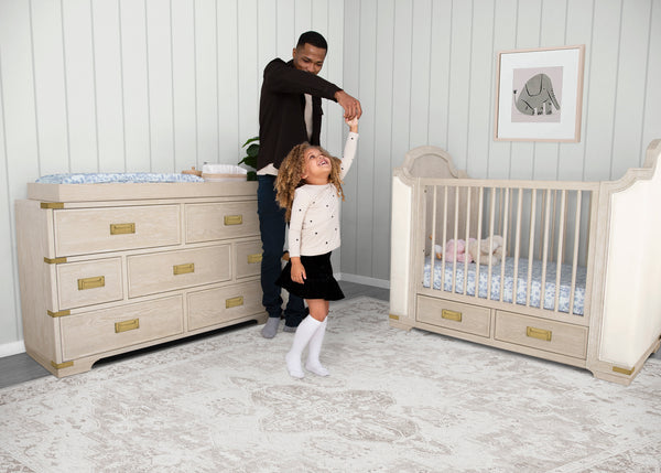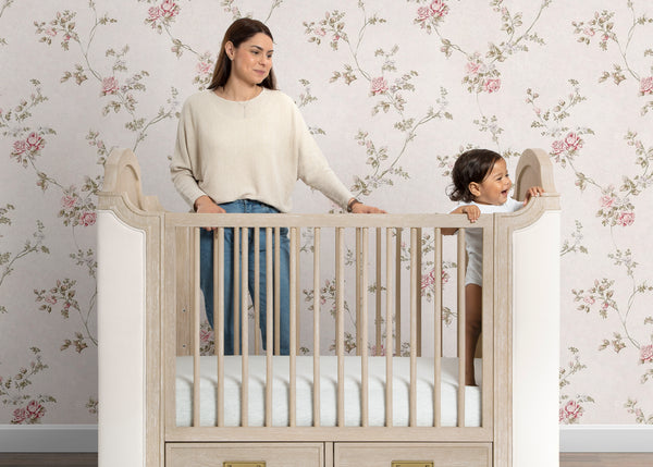 This statement making crib featuring richly grained ash wood elevates any nursery.