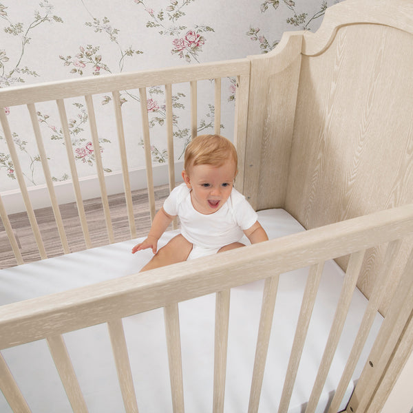 Modern acrylic spindles on all four sides provide a clear view of your baby.